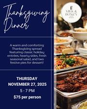 Celebrate Thanksgiving with us at Milk and Honey Ranch. We are hosting a relaxed, family-style holiday dinner where guests can slow down, enjoy the evening, and share a comforting meal surrounded by the peaceful countryside. Dinner is $75 per person, which includes a full traditional Thanksgiving spread prepared with fresh, seasonal ingredients and classic flavors that feel like home.